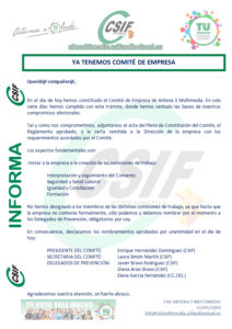 Ha llegado el día. Después de las elecciones en Antena 3 Multimedia del pasado 24 de mayo, elecciones que CSIF ganó a CC.OO. por 5 delegados a 4, los nueve elegidos se reúnen por primera vez con el objetivo de constituir el Comité de Empresa, el primer Comité de Empresa de Antena 3 Multimedia. Será el 31 de mayo a las 13:00 horas, en la sala de reuniones de Ingeniería de Atresmedia con el siguiente orden del día.